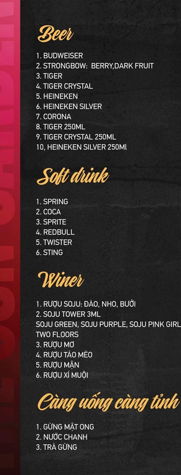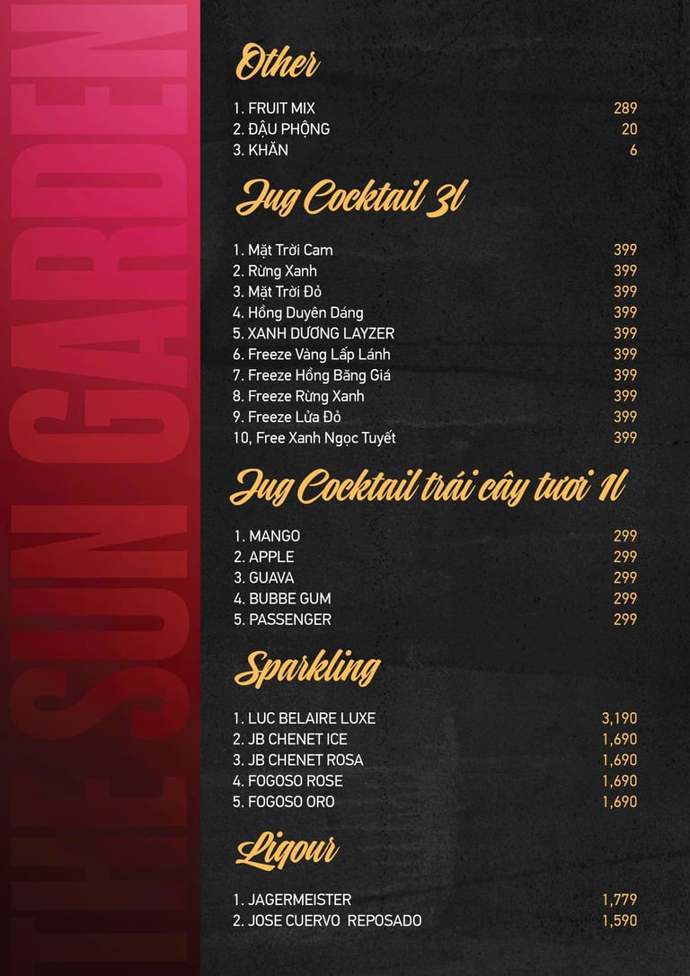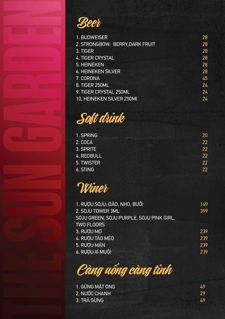 Tọa lạc tại 216 Hoàng Văn Thụ, phường Chánh Nghĩa, Thủ Dầu Một, The Sun Garden là không gian beer garden chill chill mang phong cách mở, thoáng mát và cực kỳ “chill”. Quán được nhiều người gọi vui là “quán nhậu kiểu chill” – nơi bạn có thể vừa thưởng thức bia mát lạnh, vừa nhâm nhi món ngon cùng bạn bè trong không khí thoải mái, vui tươi.